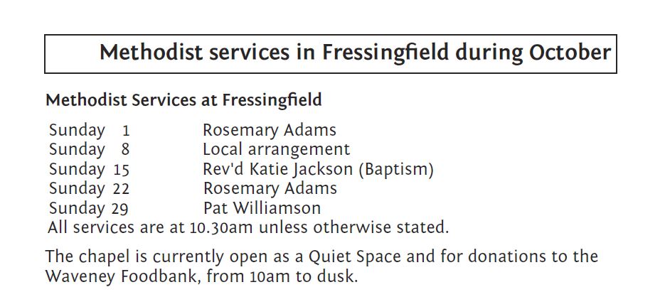 Fressingfield Methodist Church is one of ten churches in the Waveney Valley Ecumenical Partnership, the majority of them in villages, and under the care of two full time ministers.